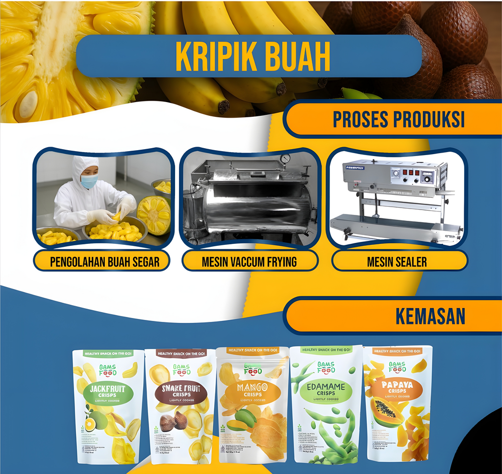 Keripik buah dari BAMS hadir bukan hanya sebagai camilan lezat, melainkan sebuah pilihan gaya hidup sehat dan berkelanjutan. Dibuat dari buah segar organik pilihan seperti nangka, salak, pisang, dan pepaya, setiap keripik kami diproses dengan teknologi vacuum frying yang canggih. Teknologi ini memastikan kerenyahan optimal sekaligus mempertahankan warna, rasa alami, dan nutrisi buah tanpa memerlukan tambahan pengawet.